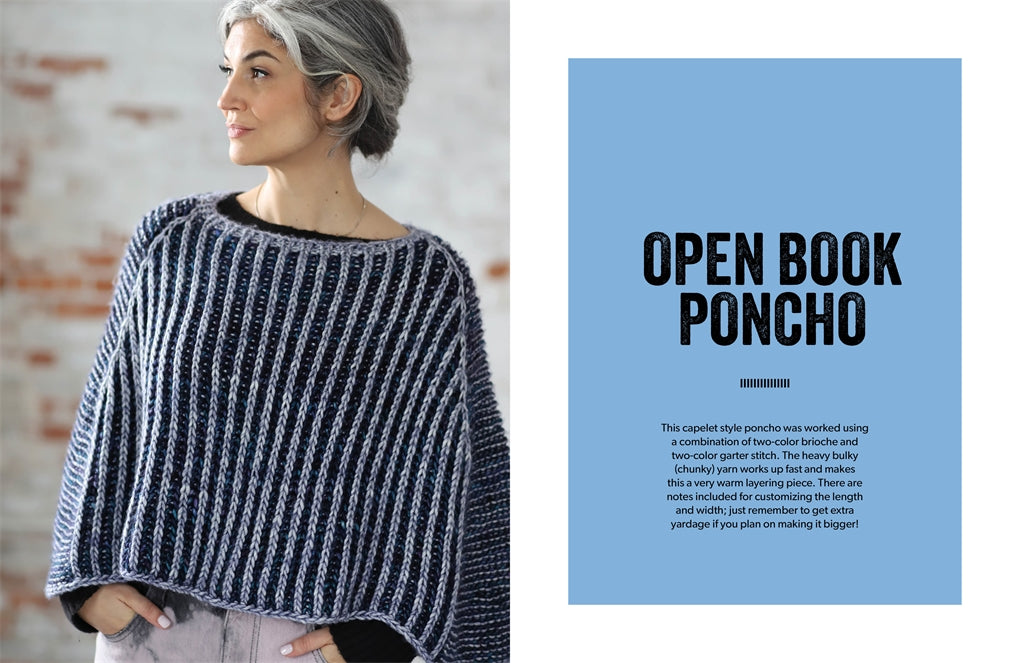 The 15 skill-building projects are for accessories including hats, cowls, scarves, mittens and slippers and there is also a striking one-size-fits-most poncho. The pattern collection includes one colour and two colour brioche designs that are beginner-friendly but result in beautifully squishy, eye-catching finished pieces.